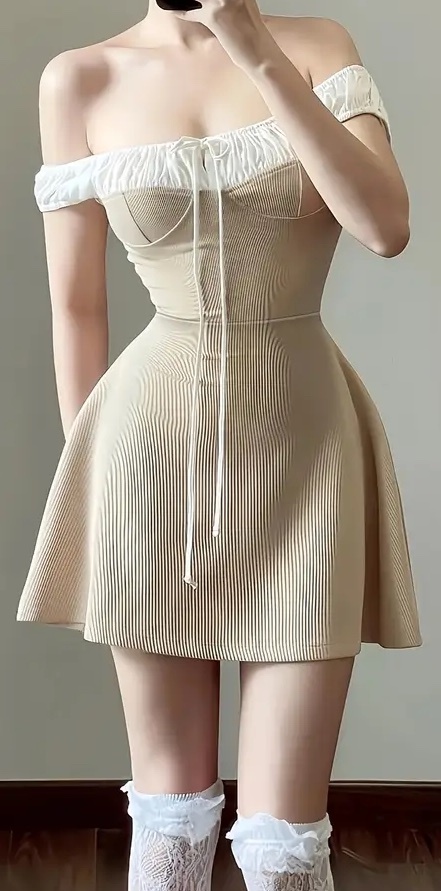 - オフショルダー ミニワンピース レース アプリコット 3Lサイズ(2596)
