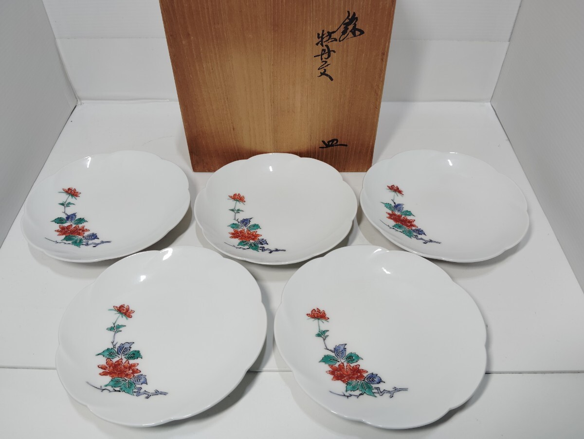 > 十三代 酒井田柿右衛門 錦 牡丹文 皿 5客 14.5cm 共箱 濁し手 和食器 小皿