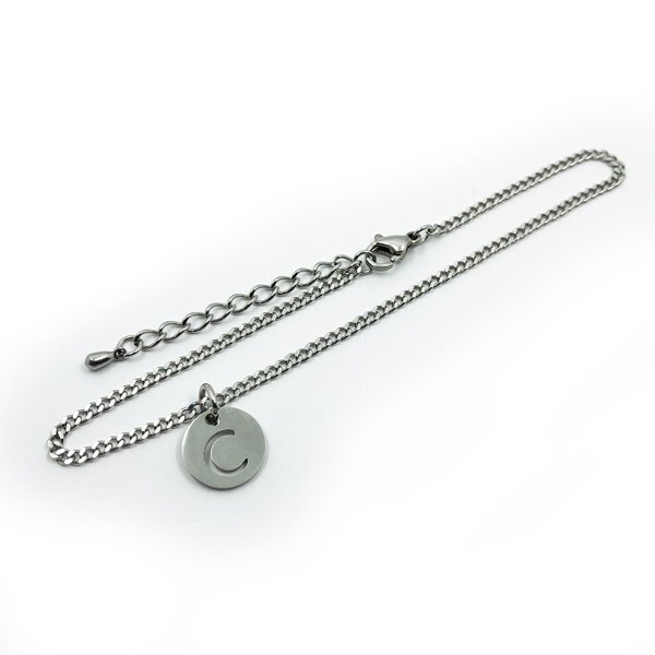 - C イニシャル アルファベット アンクレット ステンレスチェーン 喜平2面カット 幅2.2mm 25cm(21cm+4cmアジャスター)FN213C