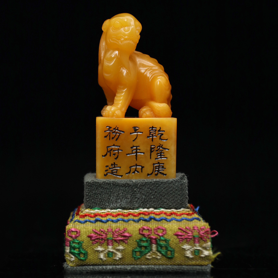- ▽鴻▽清朝時代 寿山石 田黄石彫 瑞獣鈕印章 乾隆庚子年内府 箱付 時代物 中国古美術 骨董品