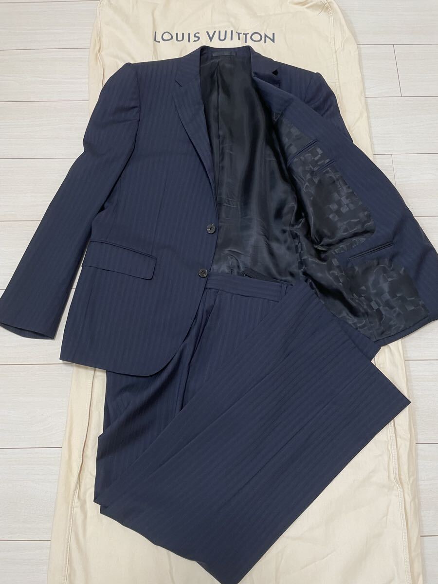 > 【超レア】光沢ダミエ裏地 LOUIS VUITTON ルイヴィトン スーツ ダークネイビー ストライプ  セットアップ サイズ50