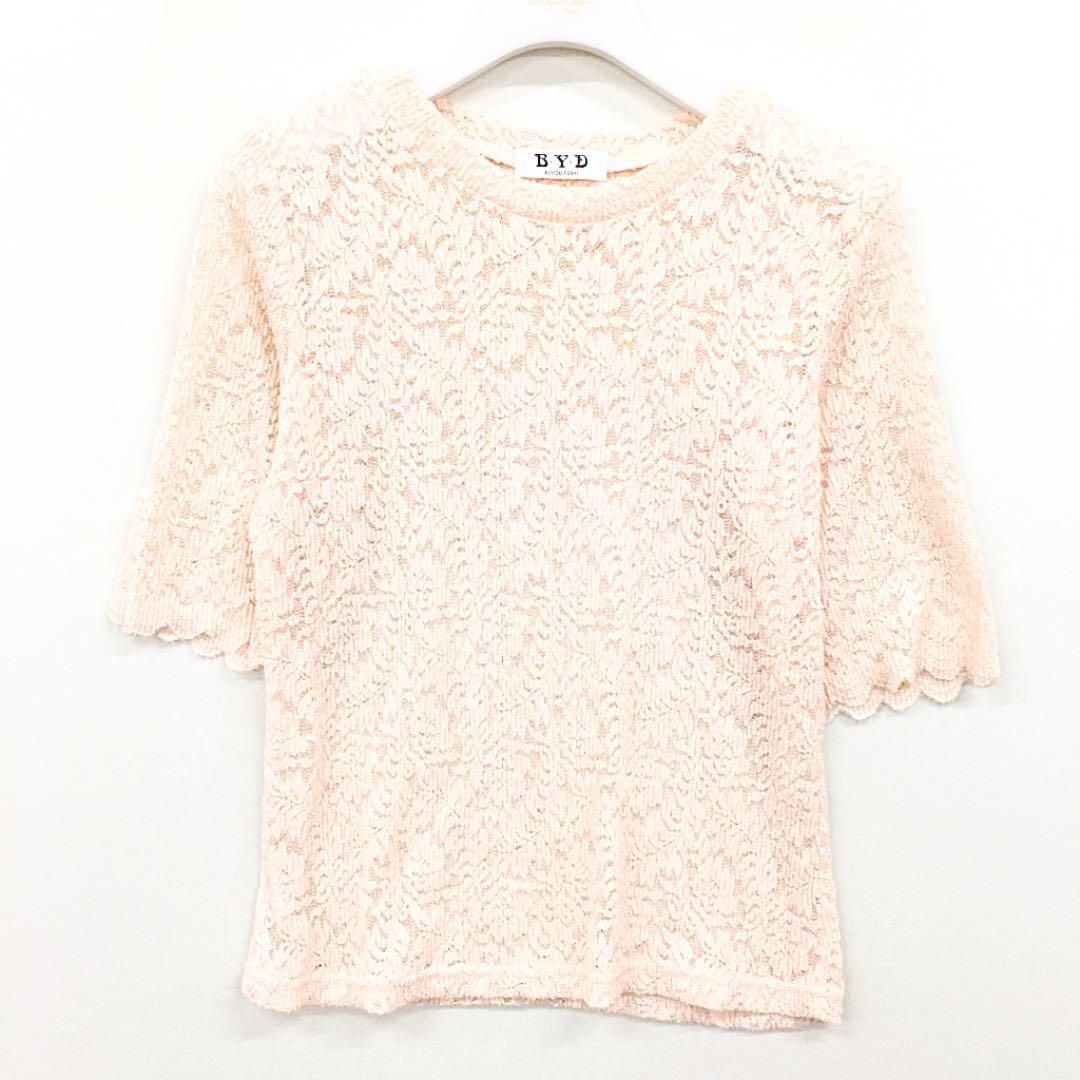 - 半袖レースカットソー ピンク 韓国ファッション