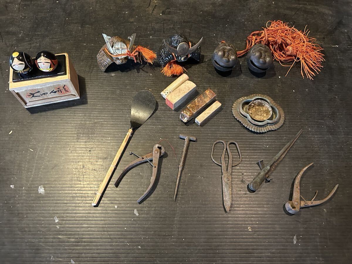 - アンティーク 小物 まとめて 印材 人形 茶道具 爪切り はさみ 鈴 兜 引手 古道具