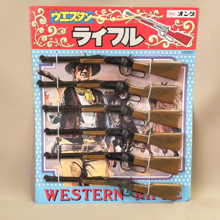 - 【未使用 新品】1970年代 当時物 オンダ ウェスタンライフル ダイキャスト 6丁付 (昔の ビンテージ 昭和レトロ 西部劇 駄玩具 キャップガン