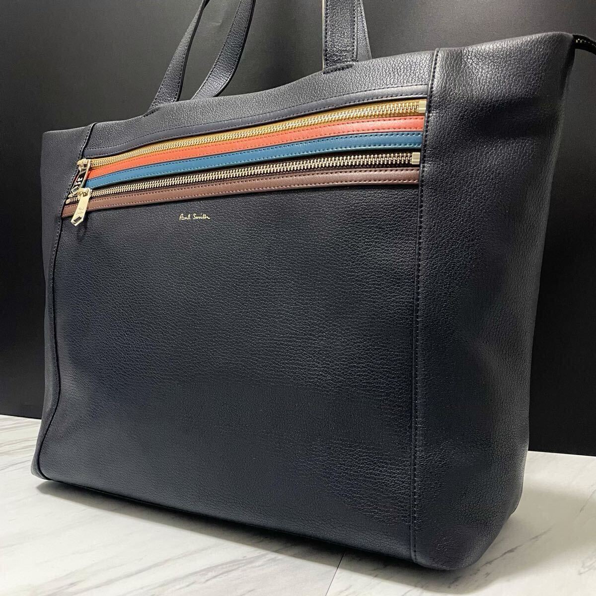 - 極美品/A4●ポールスミス Paul Smith トートバッグ マルチストライプ ロゴ 肩掛け 本革 オールレザー 紺 ネイビー メンズ ビジネス 大容量