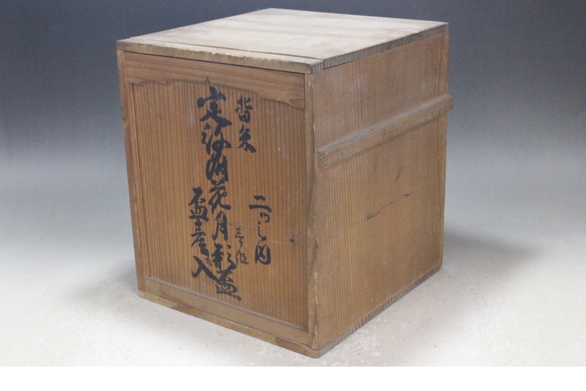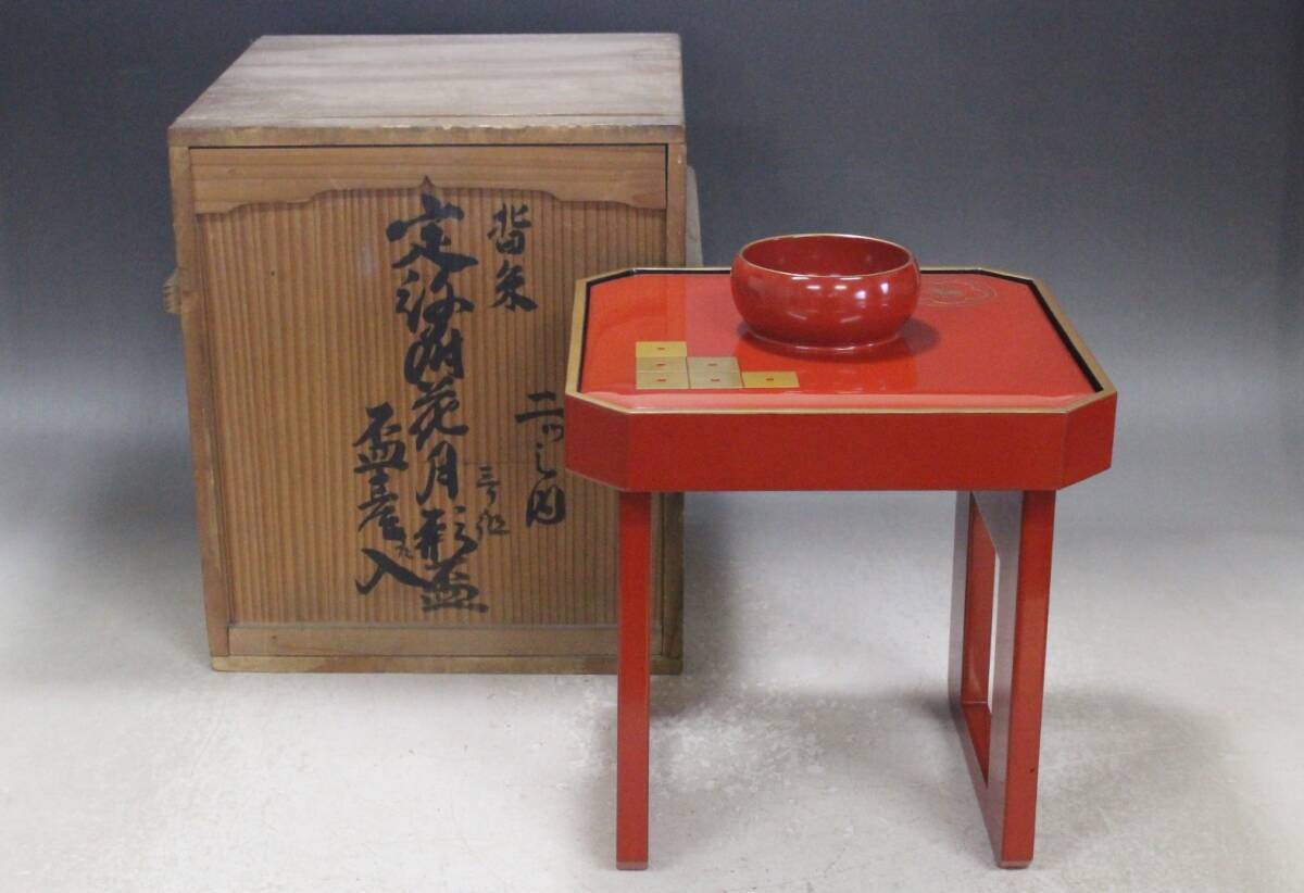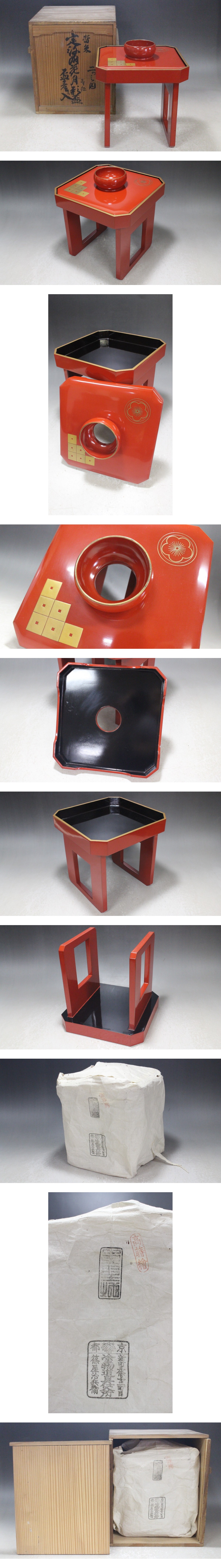 - 京都篠屋治兵衛 黒朱漆塗 定紋付花月形 蒔絵盃台 (高さ22.5cm) 杯台 時代物 漆器工芸品 チ57