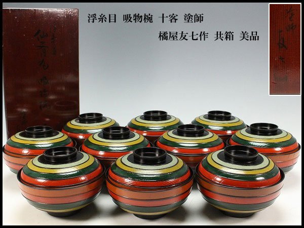 - 【金閣】浮糸目 吸物椀 十客 塗師 橘屋友七作 共箱 美品 旧家蔵出 送料無料(XA956)