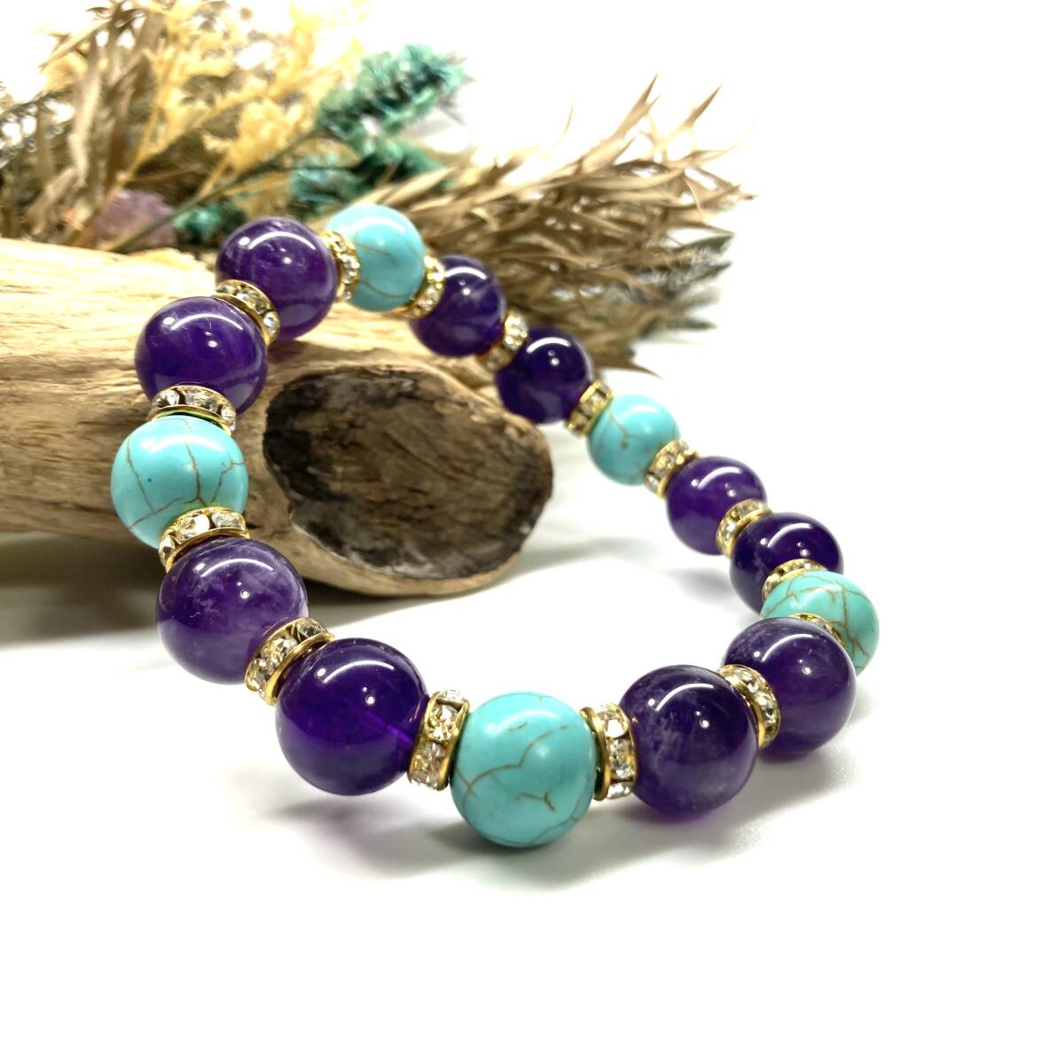 - ターコイズ&アメジスト パワーストーン ブレスレット 天然石ブレス (ゴールド) 12mm 金運 仕事運 メンズ・レディース 男性 女性 #2