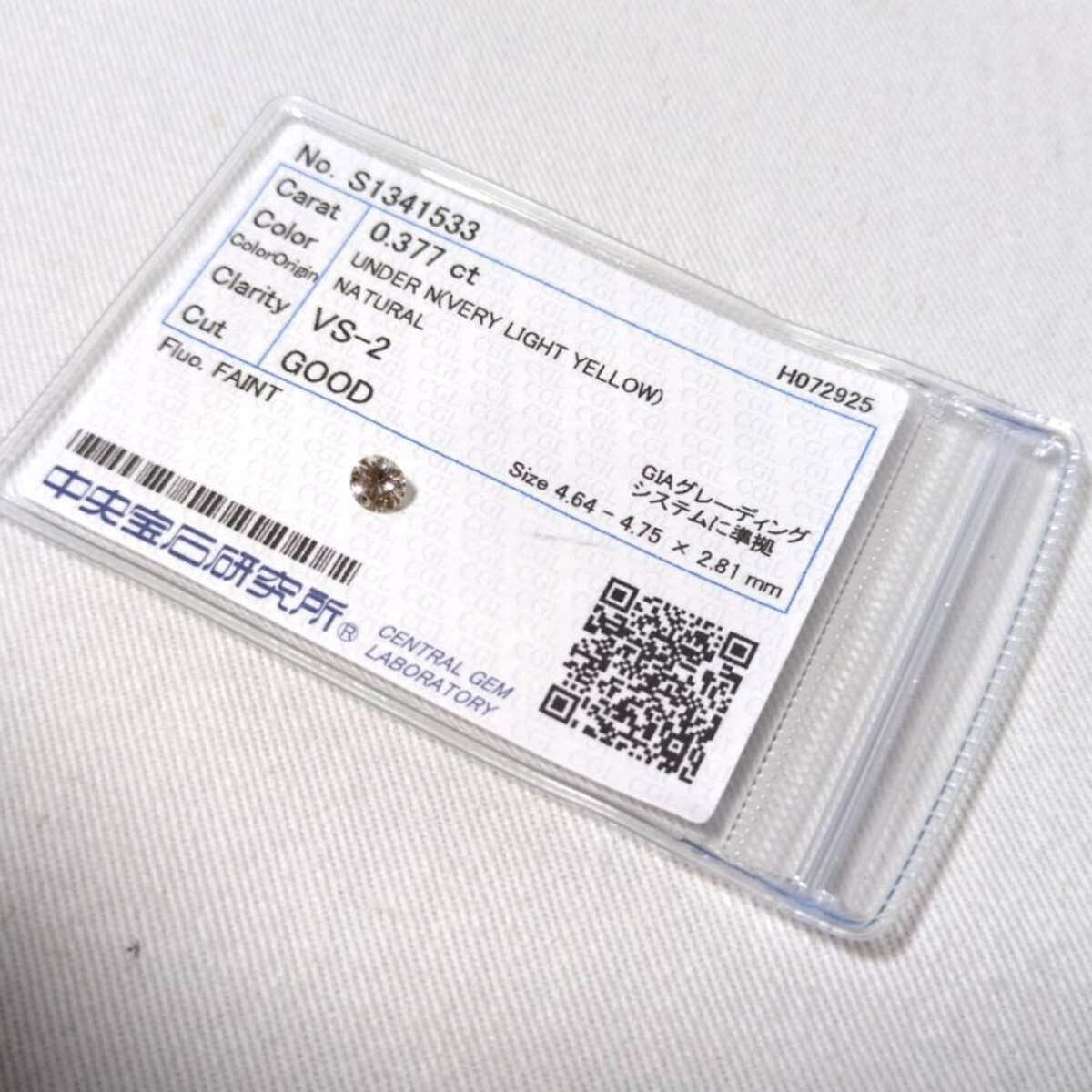 > ダイヤモンド ルース 0.377ct UNDER N(VERY LIGHT YELLOW) VS-2 GOOD FAINT 中央宝石研究所