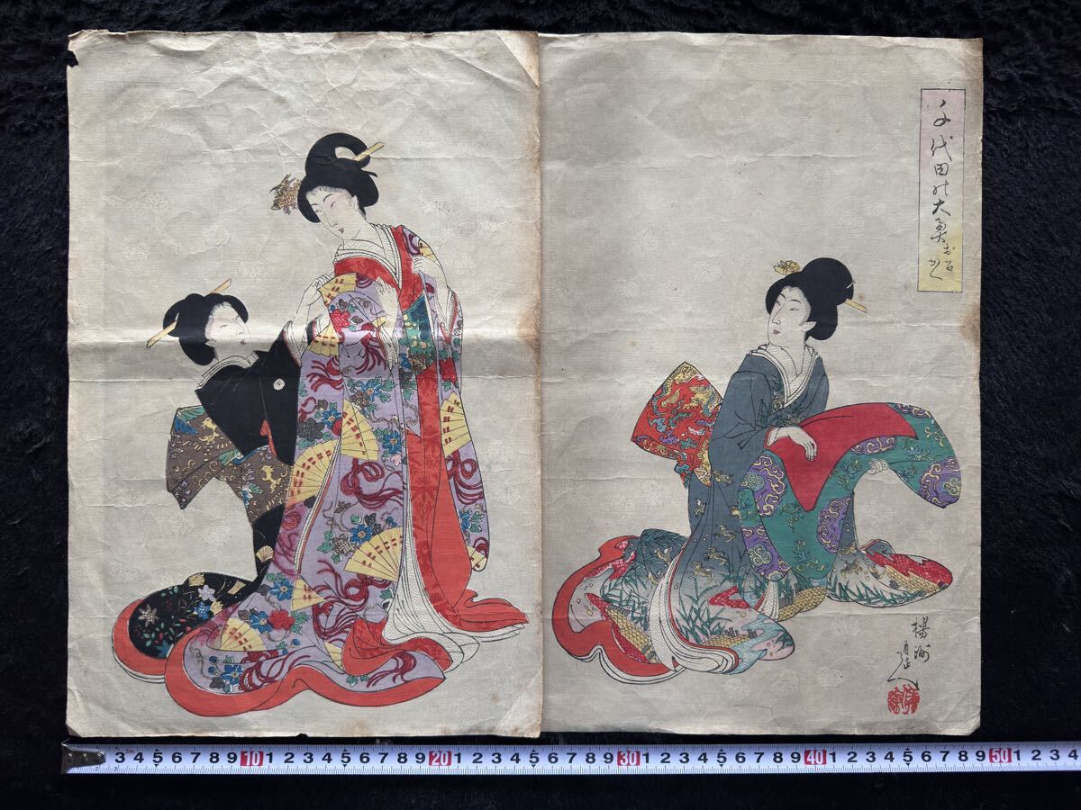 - 明治期/真作 楊洲周延「千代田の大奥 お召かへ」本物浮世絵木版画 美人画 錦絵 大判 二枚続き