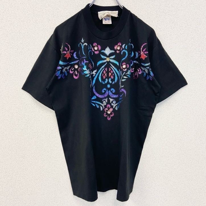 > 古着 used 90s 半袖プリントTシャツ ヴィンテージ シングルステッチ クルーネック 黒 ブラック XLサイズ