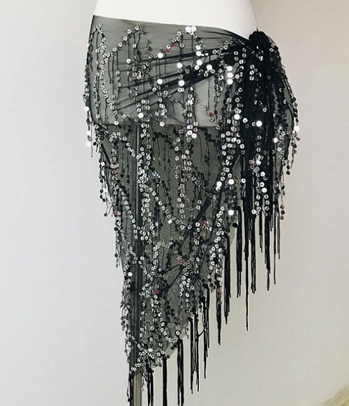 > ヒップスカーフ メッシュ フリンジ 無地(ブラック×シルバー)薄手 ショール 冷房対策 ベリーダンス 新品 未開封
