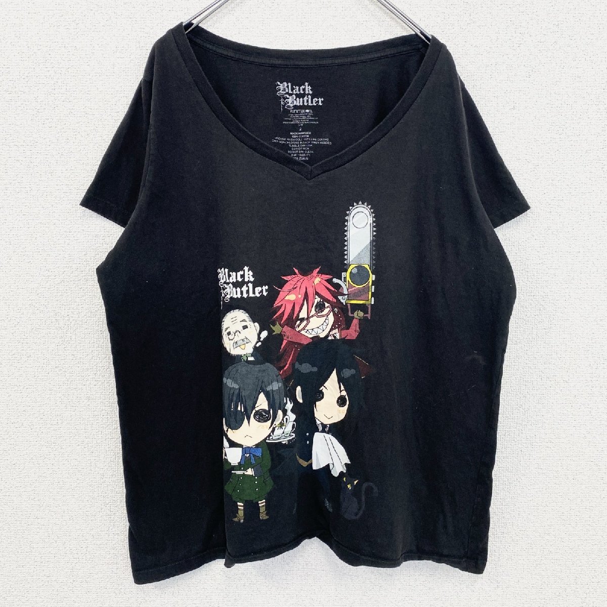 - 古着 used 黒執事 Black Butler セバスチャン メキシコ製 半袖キャラクタープリントTシャツ Vネック ブラック
