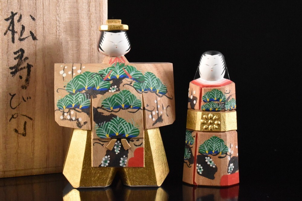 - 【雲】某収集家放出品 木製 色絵 雛人形彫刻形 置物 在銘 共箱 古美術品(旧家蔵出) F8090