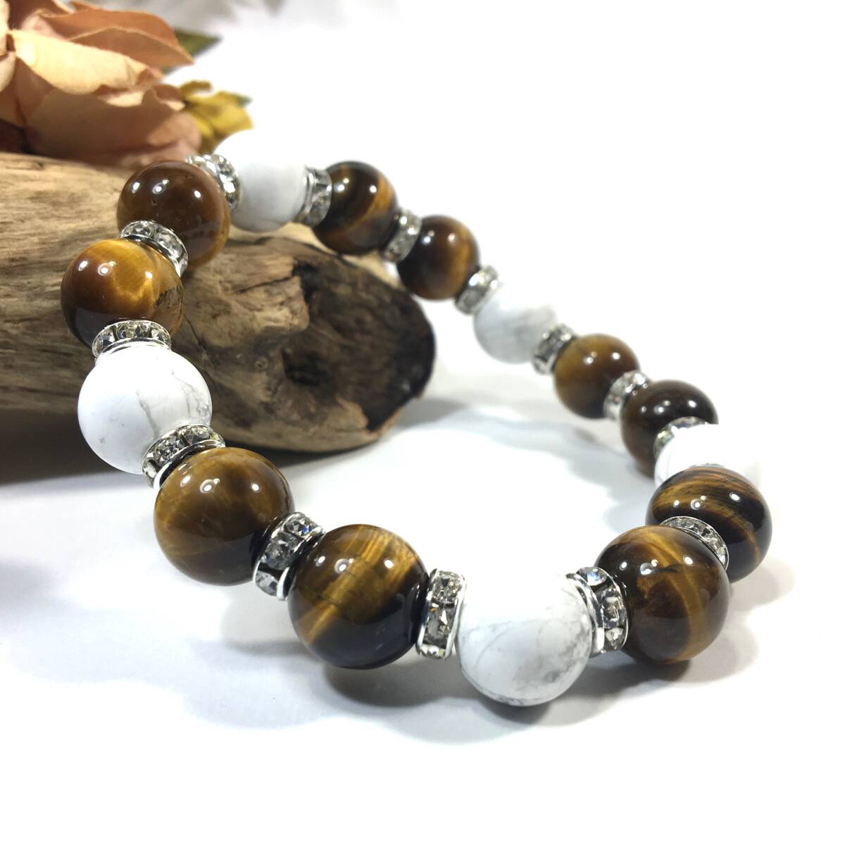 - タイガーアイ&ハウライト パワーストーン ブレスレット 天然石ブレス (シルバー) 12mm 幸運 開運 メンズ 男性♪