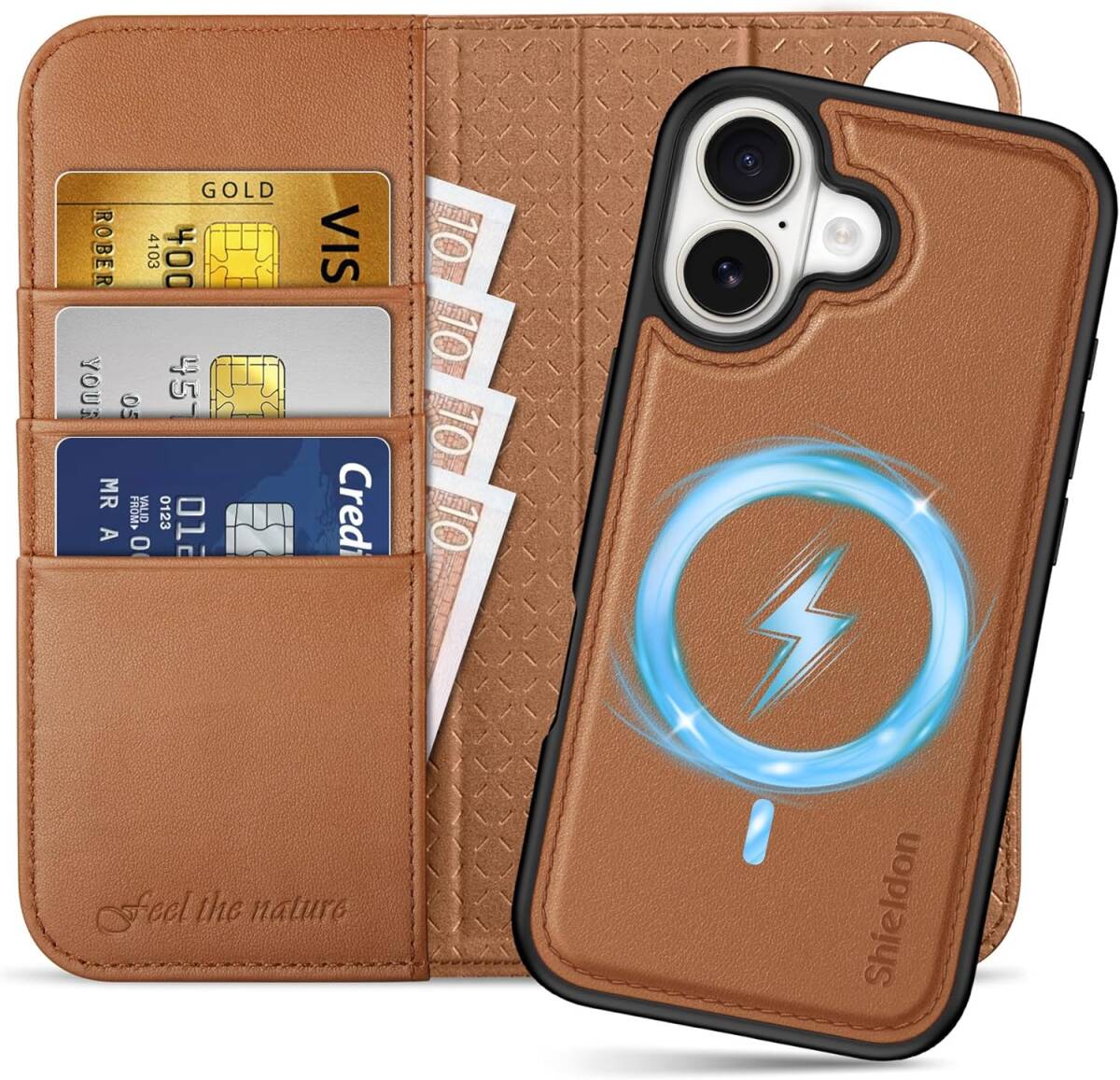 - SHIELDON iPhone17 手帳型本革ケース 2in1分離式 サドルブラウン MagSafe対応 カード収納[RFIDブロッキング] 衝撃吸収 C-2IN1-SBRO