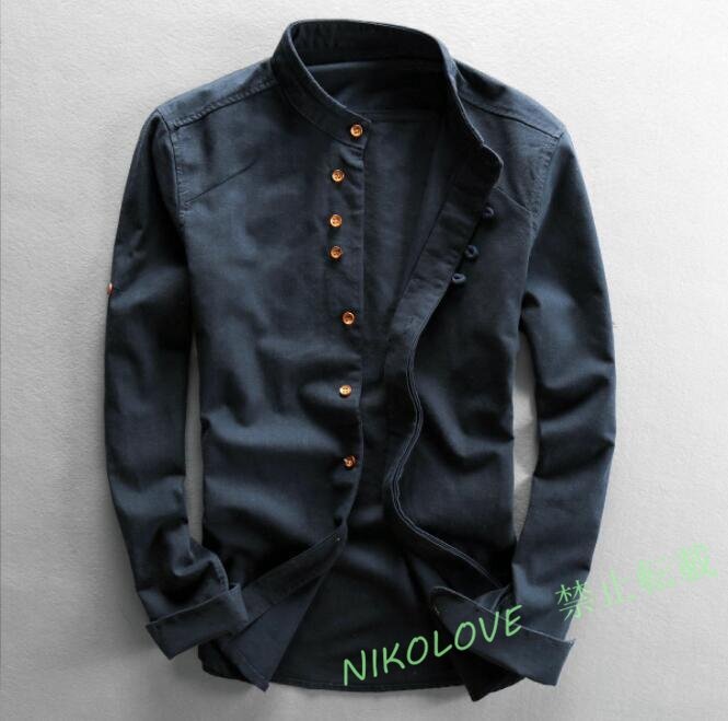 > ☆新品メンズ 長袖シャツ 上質 リネンシャツ 紳士 スタンドカラー 綿麻シャツ レトロ 立襟カジュアル お洒落 大きいサイズあり ネイビー