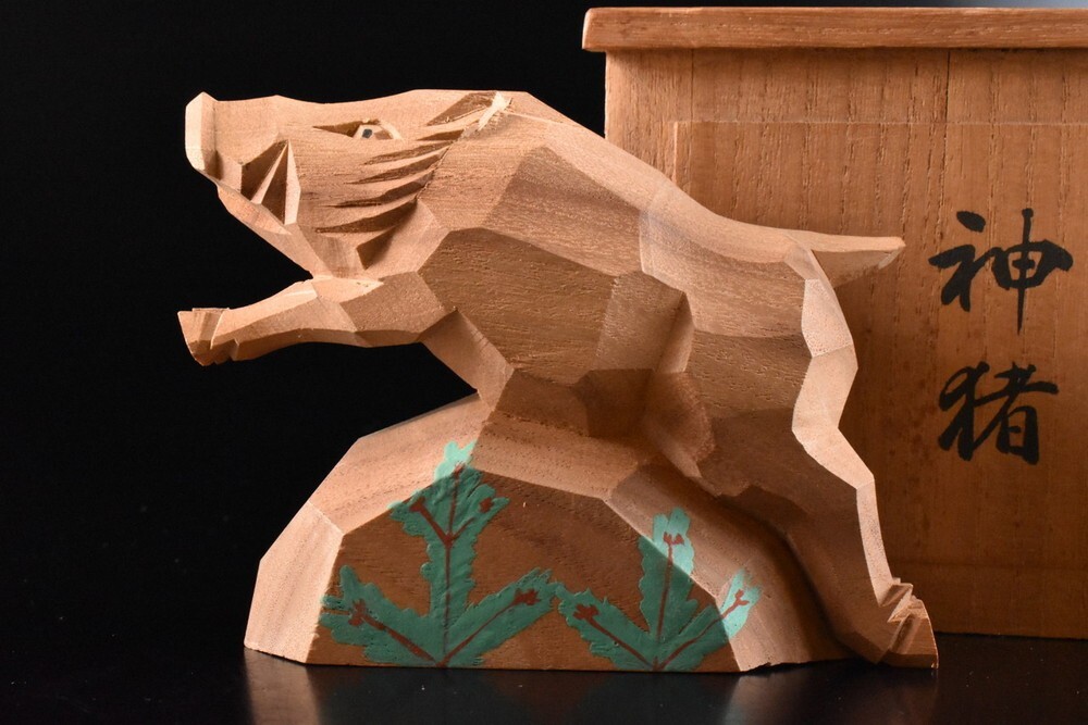 - 【雲】某収集家放出品 木製 木彫 猪置物 在銘 共箱 古美術品(干支オブジェ) F8640