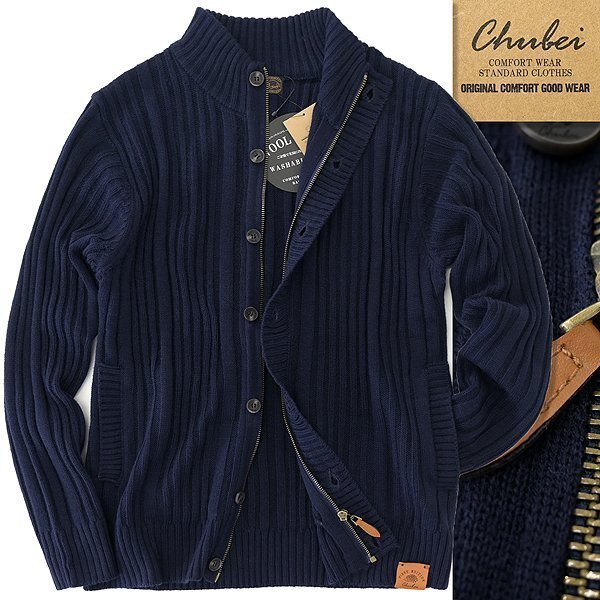 - 新品 チュウベイ リブニット ジップ ボタン スタンド カーディガン LL 紺 【CH1444335_79_LL】 秋冬 CHUBEI ウール混 洗える ブルゾン