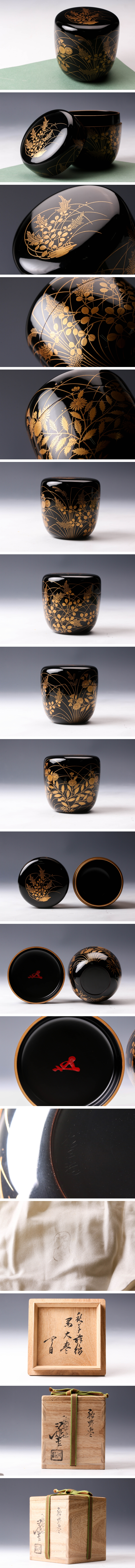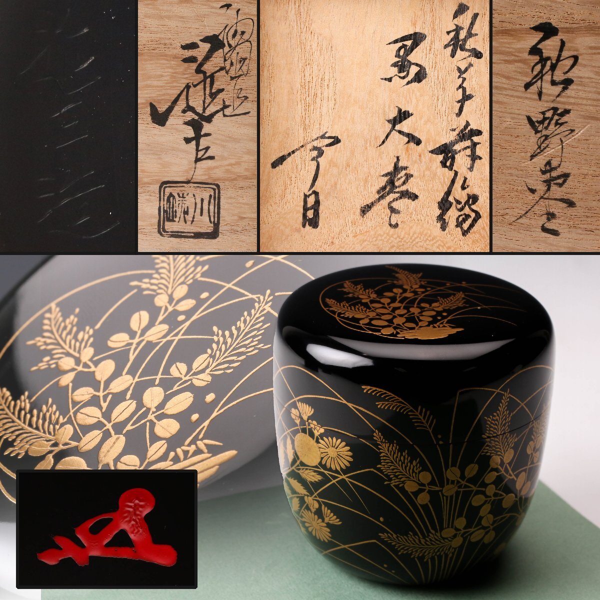 【佳香】五代 川端近左 萩草蒔絵黒大棗 花押 裏千家十五代鵬雲斎(汎叟宗室)書付箱 共布 茶道具 本物保証拍卖