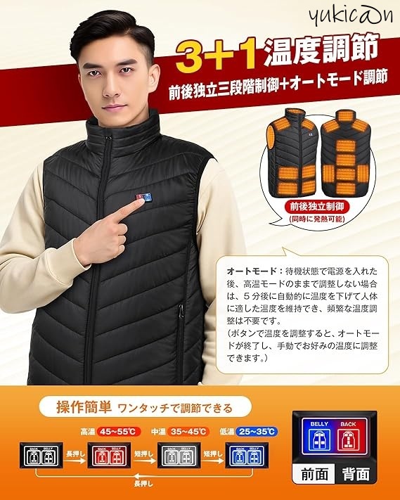 > 電熱ベスト ヒーターベスト XL 15箇所発熱 30000mAh 速暖 保温 超長連続使用時間 オートモード付き 省エネ 水洗い可 男女兼用 節電