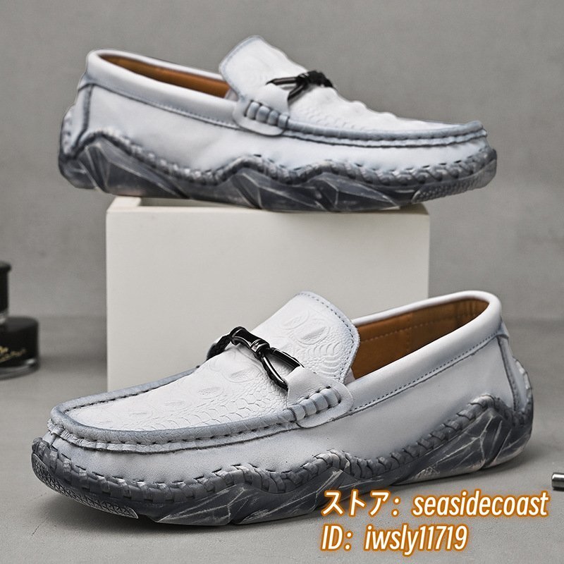 > 超美品★本革 ローファー スリッポン 新品 メンズ レザーシューズ 牛革 ビジネスシューズ ドライビングシューズ 紳士靴 白/灰 25.0cm