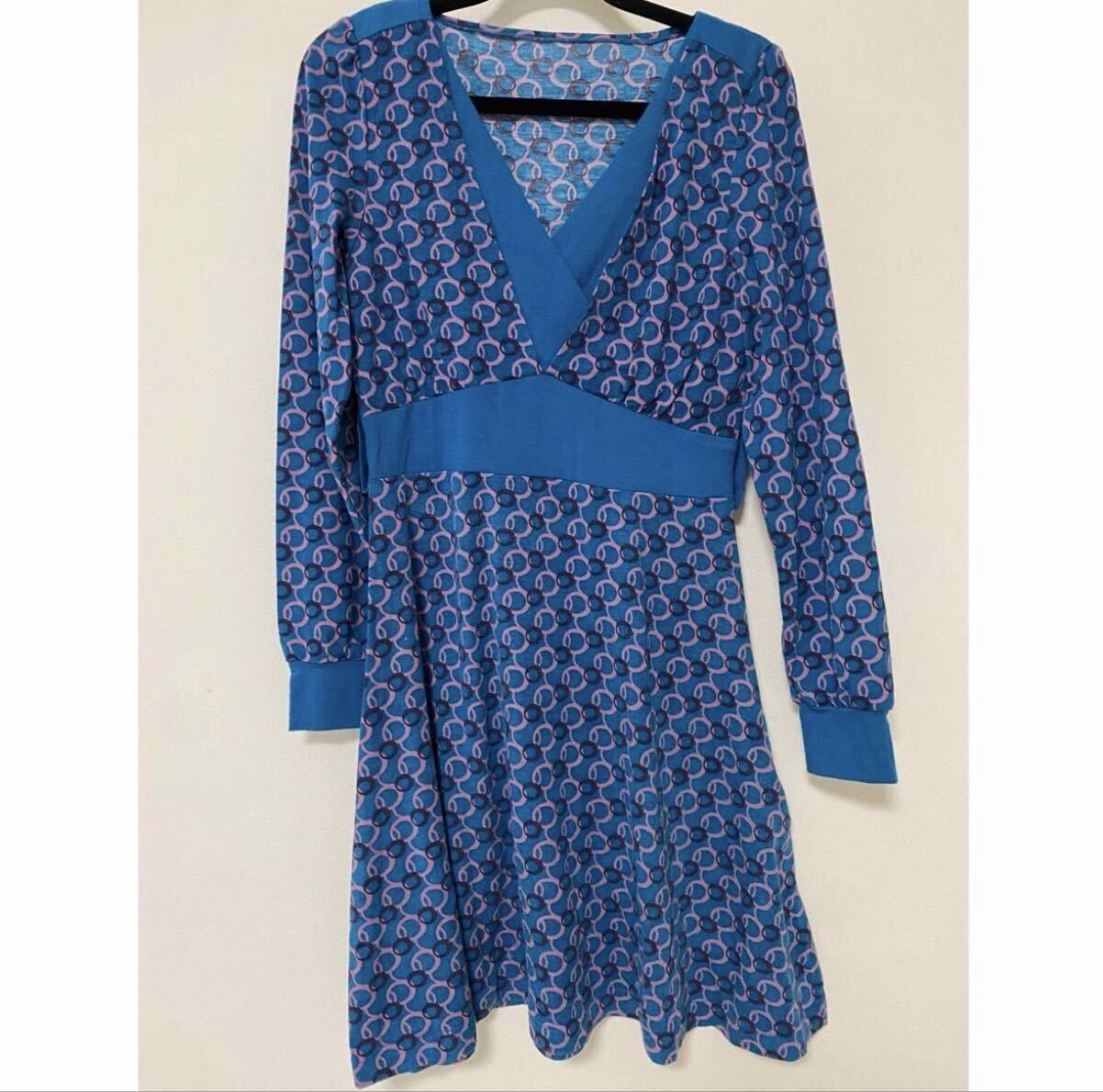 - 長袖ワンピース Mサイズ ブルー 総柄 Vネック ブルー系