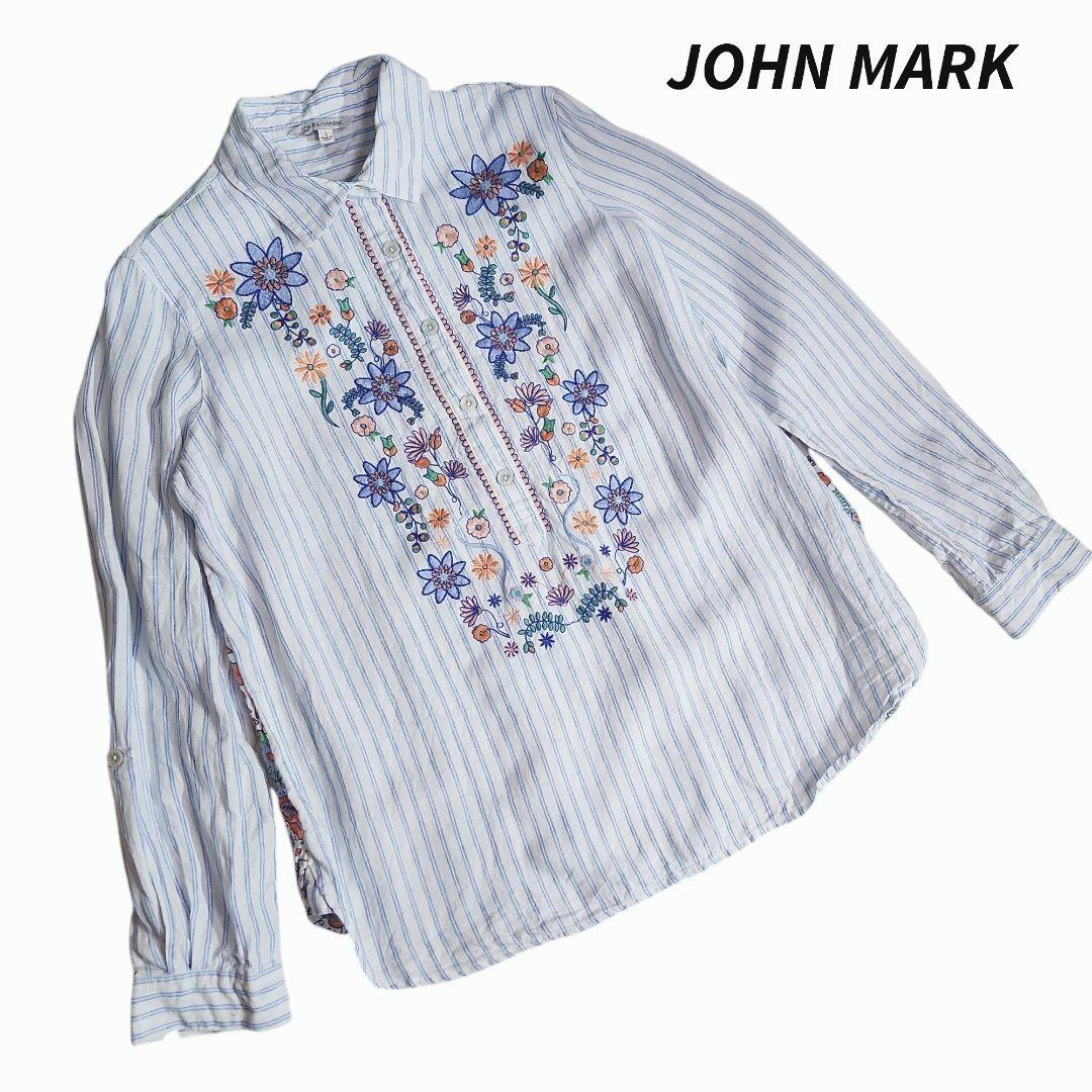 > JOHN MARK 刺繍デザイン・麻リネン・切り替えストライプ長袖シャツ 白&ライトブルー プルオーバー Aライン 花柄 8530