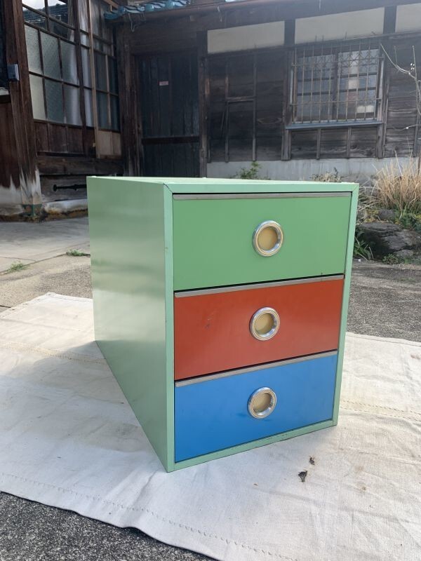 - 【蔵出し】★レトロ 収納『カラフルでかわいい金属製衣装ケース 3段引き出し』アイアン★検:(初だし/うぶだし/収納棚/箪笥/当時物)0209C