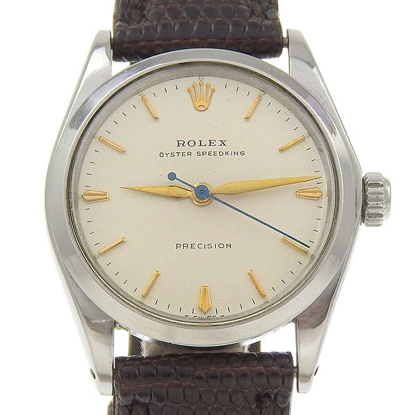|                                            当店の時計は基本的にオーバーホールをしてません。記載の不備や付属の欠品、動作異常につきましてはご注文のキャンセルにて対応いたします。時計の修理や、部品の交換は対応できません。あらかじめご了承ください。                                                                                    防水性の保証はしておりません。また、購入後の修理につきましては、いかなる理由があっても修理費の負担などは一切いたしません。                                        |                                                        |                                             TY002086                                  ●ブランド       ロレックス                    ●モデル名       スピードキング                    ●性別       ボーイズ                    ●ケース素材       SS                    ●ベルト素材       レザー                    ●風防素材       プラスチック                    ●文字盤色       アイボリー文字盤                    ●機械タイプ       手巻き                    ●Ref.No       6430                    ●シリアルNo       17番台                    ●ケース幅(リューズ除く)       約 30 mm                    ●腕周り(最長)       約 18 cm                    ●ラグ幅       約 17 mm                    ●付属品       なし(本体のみ)                                  ●風防       小キズ                    ●ケース       スレ、小キズ、打痕                    ●ベゼル       スレ、小キズ、打痕                    ●針       少々ヤケ                    ●文字盤       ヤケ、少々ヨゴレ                    ●ベルト/ブレスレット       スレ、ヤケ、尾錠に腐食、遊革欠損、ベルト社外品                 ●日差(平置き)       ―                   ●備考※特記事項        リューズ外れ                                  ●本体ランク       D                    ●ベルトランク       B                                            <ご購入時の注意点>              商品以外に付属している袋や箱はランクに含まれておりません。       画像以外の付属品はありません。ハンガーも対象外です。       モニターやカメラの特性上、画像と実物の色が多少異なる可能性がございます。                                              必ずご入札前に当店のお取引ガイドをご確認ください。         同意の上で入札をお願いいたします。                     中古品という事をご理解の上、ご入札をお願いいたします。                    営業時間外での入札取り消しは対応できませんのでご注意下さい。                    ご落札後に商品の状態についての質問は受け付けておりませんので、気になる事がございましたら必ずご入札前にご質問下さい。                    原則として、お客様のご都合による返品、交換はできません。                    お客様のご都合によりお取引をキャンセルする場合は、『落札者削除』となります。                    ヤフーオークション以外の販売や直接取引等の理由により出品をキャンセルさせて頂く場合がございますので、あらかじめご了承下さい。                     新規のご入札の方、マイナス評価が多い方などはこちらから予告無しに削除する場合もありますので予めご了承ください。                                  (1)落札後に落札通知メールが自動的に送信されます。       (2)落札日を含め5日以内に「購入手続き」を進めてください。       ※商品ページの「取引ナビから購入手続きする」をクリックすれば購入手続きができます。       ※期間内に購入手続きがない場合はキャンセルとなります。       (3)決済確認後、3日以内に商品を発送いたします。発送時に当店からメールをお送りいたします。                             落札金額+送料+消費税がお支払い金額になります。              【決済方法】       銀行振り込み・クレジットカード       ※領収書、注文明細につきましてはPDF形式の電子領収書でのご提供とります。                             決済確認より1~3日以内に発送いたします。休業日は除きます。