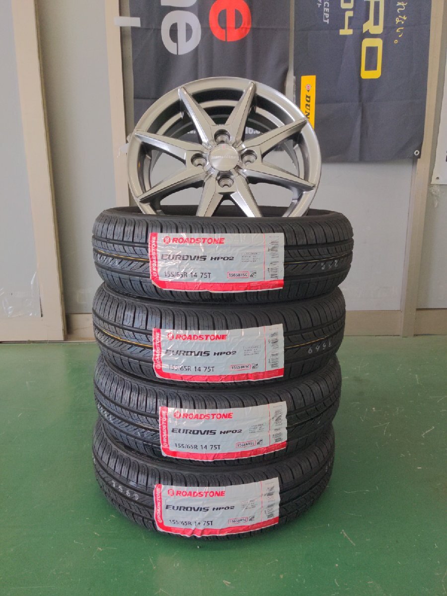 - 大田原店★新品ホイールタイヤSET4本★HS-08 14×4.5J+45 4H100★ロードストーン155/65R14★ワゴンR/N-BOX/N-WGN/N-ONE等軽自動車サイズ