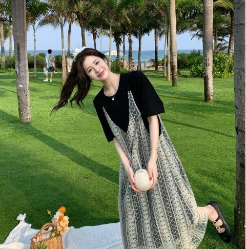 - ロングワンピース 半袖 シンプル カジュアル ゆったり 重ね着風 レディース 3XL ブラック