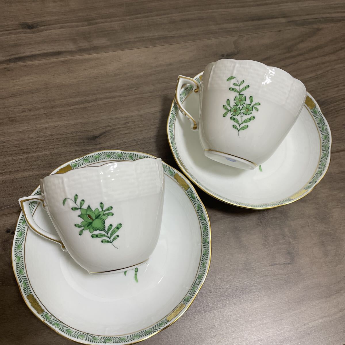 - 美品 ヘレンド HEREND カップ ソーサー アポニーグリーン 洋食器 金彩 食器 ティーカップ 2客