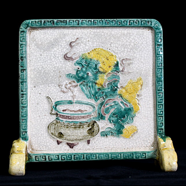 - 源内焼 三彩 獅子香炉文 硯屏 江戸時代 18世紀後半~19世紀中期 文房飾り 平賀源内 図録 源内焼(五島美術館)同手掲載