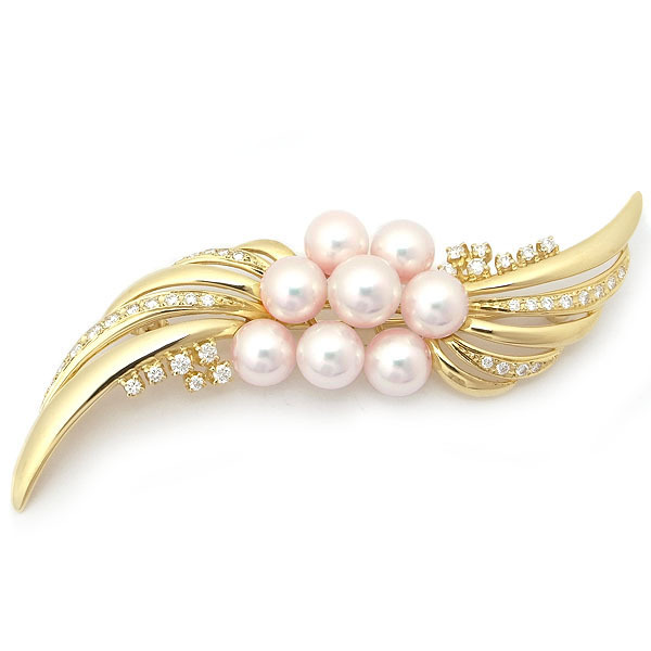 | コメント |           大きさが異なる6.8mm~7.4mmのアコヤ真珠を中心に配し、左右に緩やかなカーブを描いた5本のライン、5本のラインのうち2本にはダイヤモンド敷き詰め、アクセントにラウンドダイヤを上下にあしらったミキモト(MIKIMOTO)のブローチです。左右で若干長さが違うモチーフはまるで風を纏った羽の様な優美なデザイン。上質なパールの艶と色味、イエローゴールドの華やかさ、ダイヤモンドの可憐な輝きが襟元を彩ります。ミキモトならではの細やかな造りを楽しめるジュエリーです。 総重量15.0g 緑屋商品番号:5010043      |      | 程度 |           中古Aランク           |      | 素材・色 |           K18YG      |      | サイズ |           全長約68.4mmx幅約19.8mm      |      | 付属品 |           ギャランティーカードなし 箱なし      |