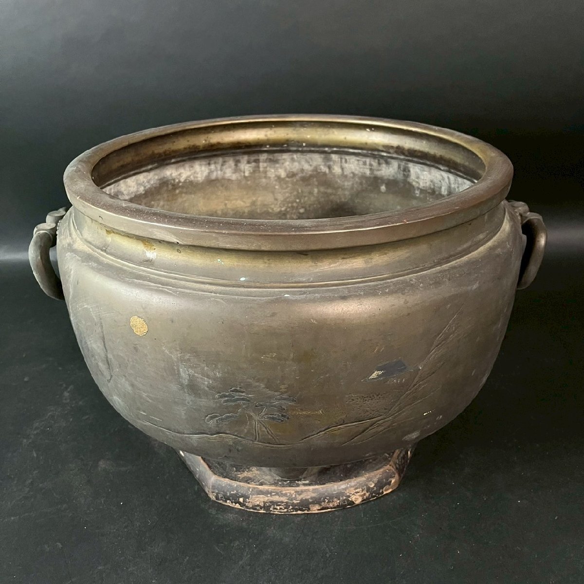 > OM0917-15‐3 火鉢 鉢 大型 銅器 銅製 古銅 丸火鉢 古木台座 古民具 料理 囲炉裏 伝統 工芸 彫刻 骨董品 高さ26㎝ 口径31.5㎝ 120サイズ