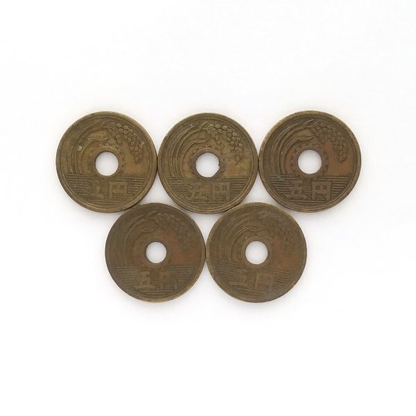 - ☆ 昭和24年 穴あり5円 楷書体 黄銅貨 国会議事堂 5枚 -1