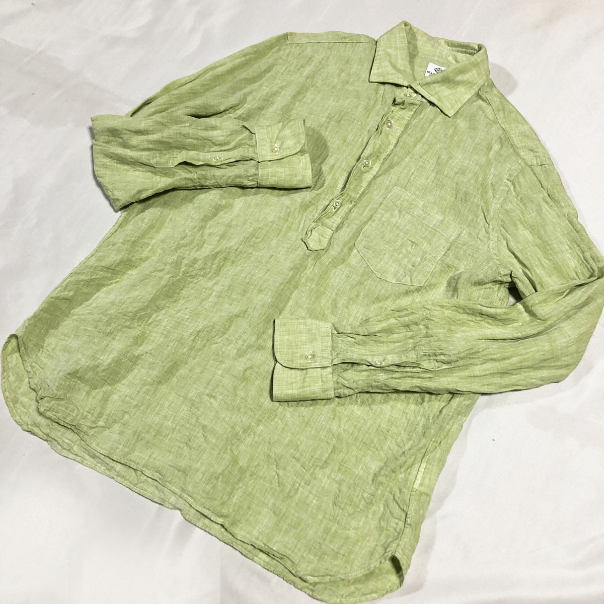 > レアカラー!! BEAMS HEART ビームスハート 麻100 ホリゾンタルカラー ハーフボタン プルオーバー リネンシャツ ライムグリーン XL