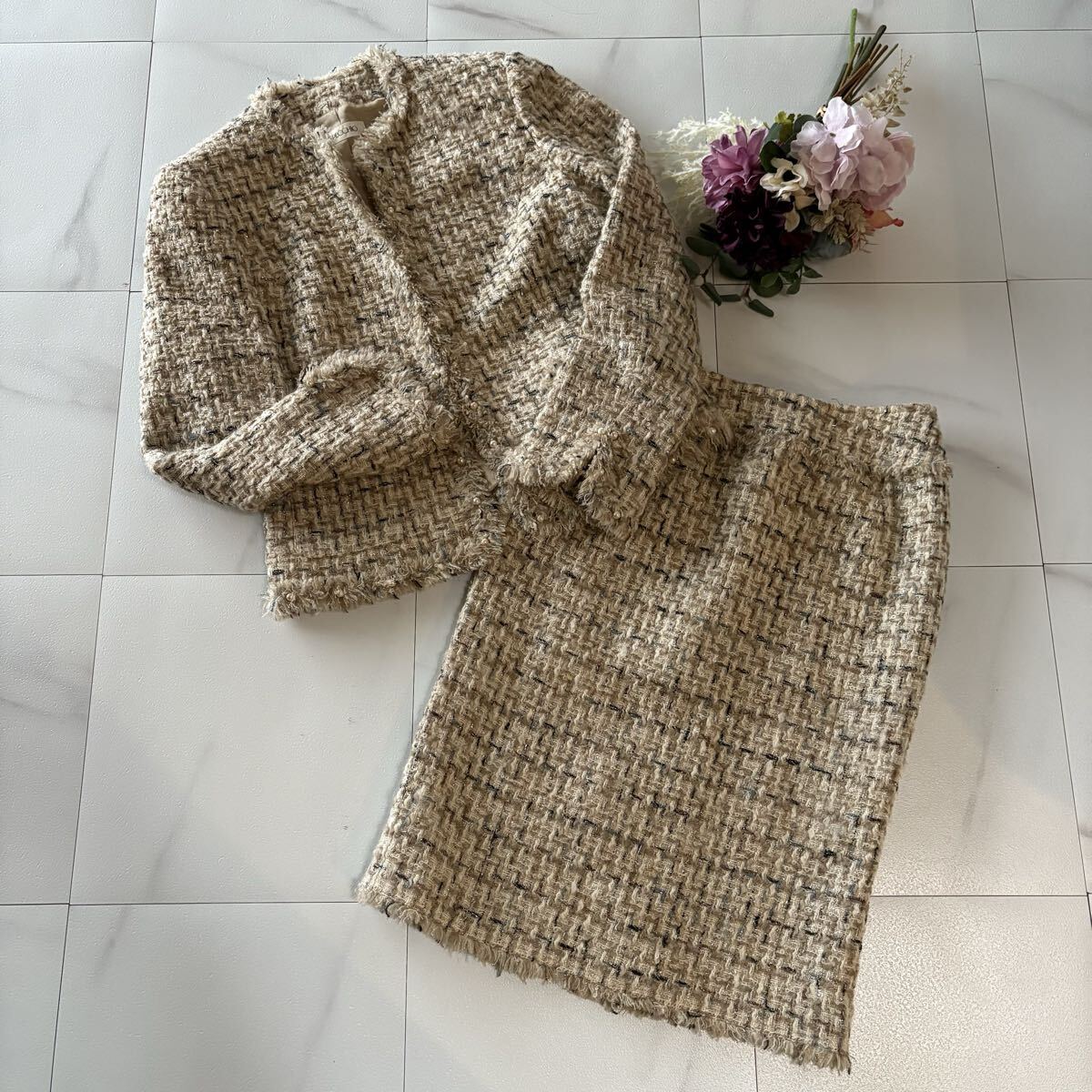 - SPECCIO ツイード ノーカラー ジャケット スカート スーツ 上下 パール 長袖 スペッチオ 白