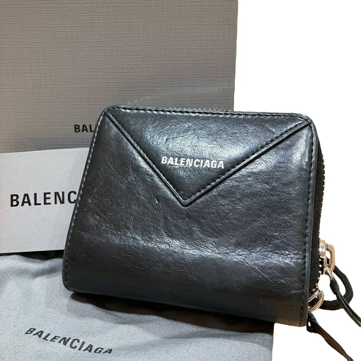- 1円 BALENCIAGA バレンシアガ ペーパービルフォード ラウンドファスナー レザー 371662 ブラック系 二つ折り財布