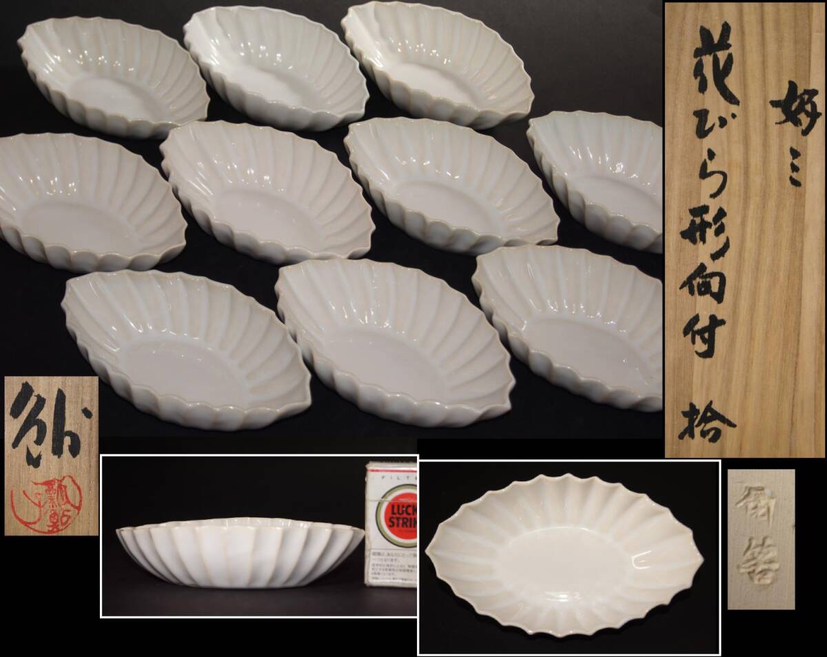 > 角筈窯【数江瓢鮎子 /教一 好ミ 花びら形向付 十客】共箱 茶道研究家 長野県茅野市生 倫理学者 小皿 小鉢 茶道具 料亭 会席 懐石道具 割烹