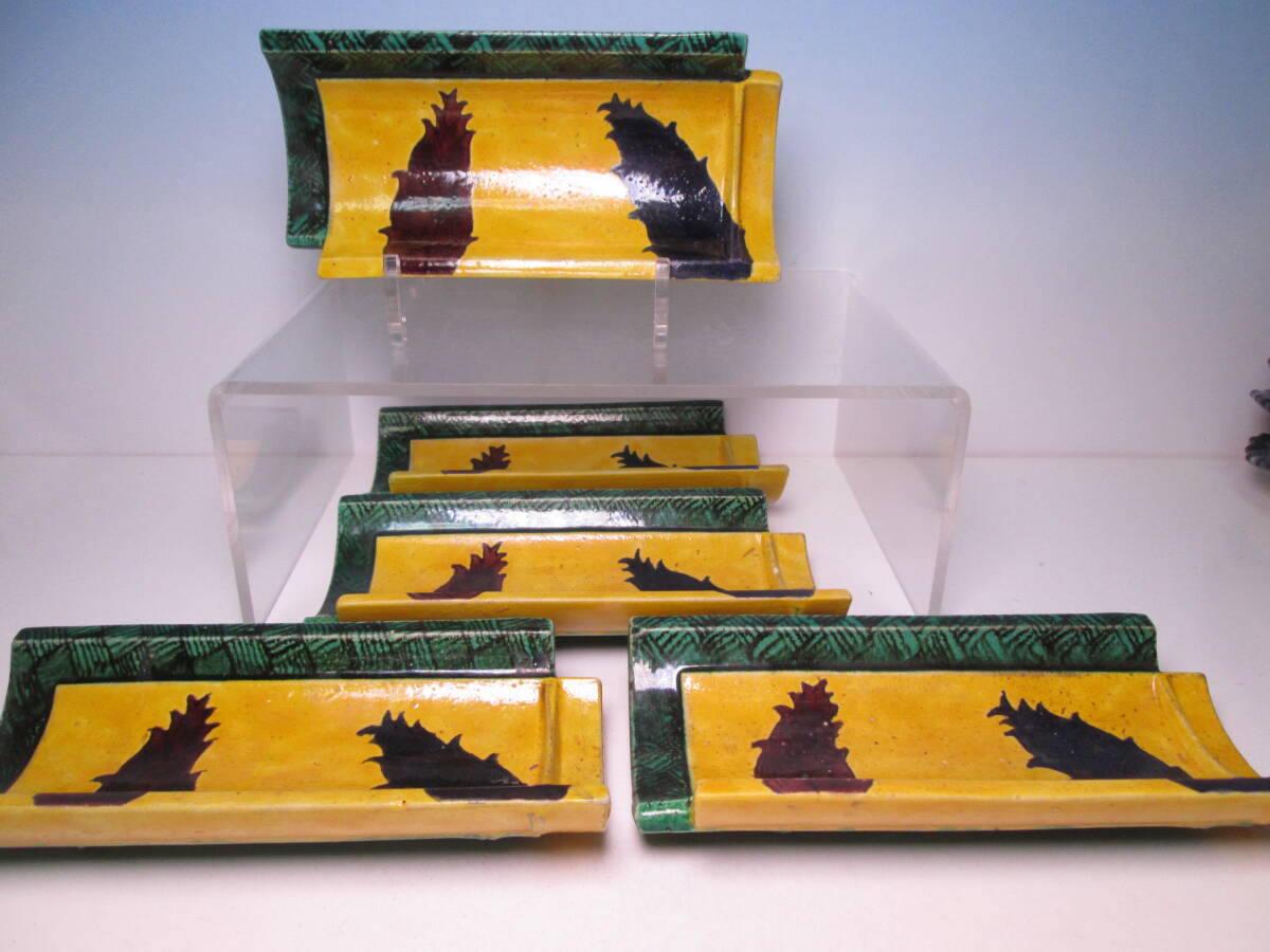 - ☆古陶磁 湖東焼 色絵 竹形 筍絵 皿向付 五客 木箱付 竹の子/盛皿/お料理屋さんの器/茶懐石/割烹/日本料理