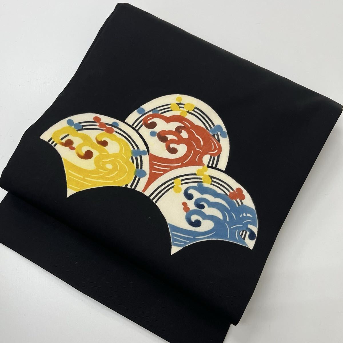 > 名古屋帯 塩瀬 黒地 青海波に荒波模様 九寸 正絹 着物 F-514