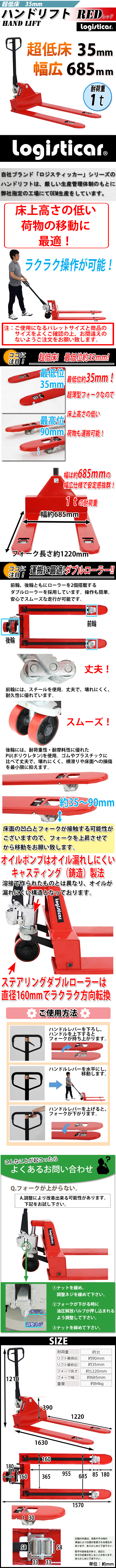 - 送料無料 ハンドパレット 超低床 35mm 幅広 幅685mm 1000kg ハンドリフト 1t 低床 ハンドトラック 赤