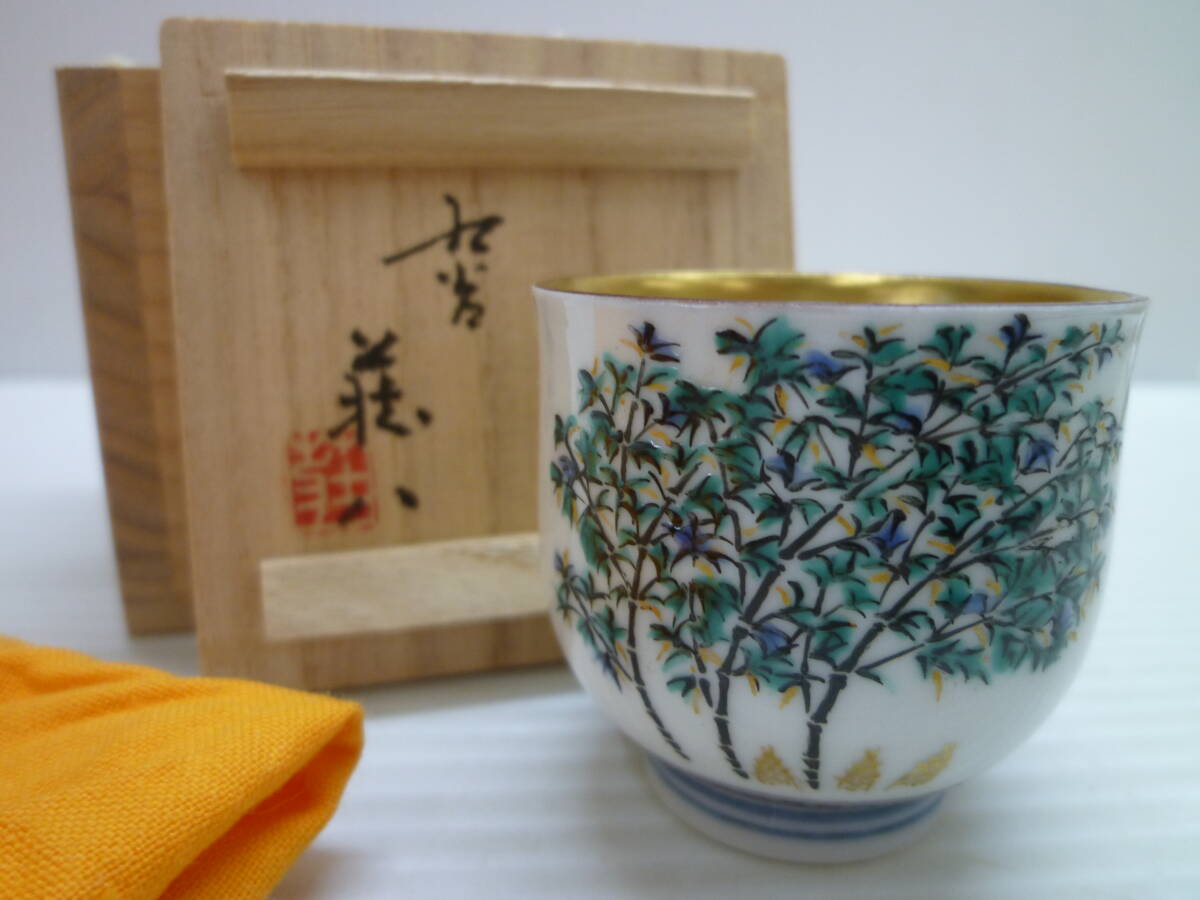 > ★九谷焼 吉田荘八 色絵竹林ノ図 盃 酒盃 酒杯 お猪口 ぐい呑 酒器 共箱 伝統工芸 石川県 ① e