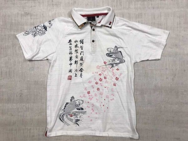 > 撫威羅守 レトロ ストリート 和柄 グランジ 鯉 漢文 書道 桜 花柄 プリント 襟ダブル 半袖ポロシャツ メンズ コットン混合 L 白