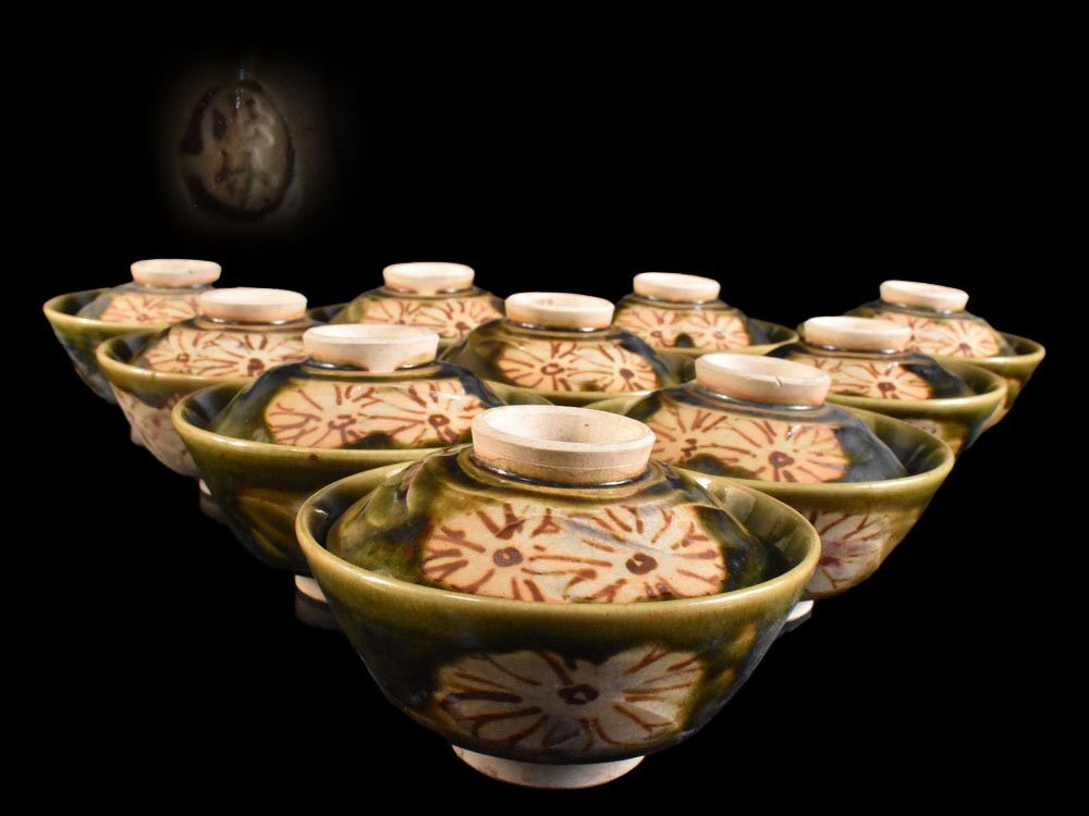 > 【雲】某資産家買取品 織部 緑釉花文蓋茶碗 10客 直径11.5cm 在銘 古美術品(蓋物懐石料理道具)BY5673 LTUbhu