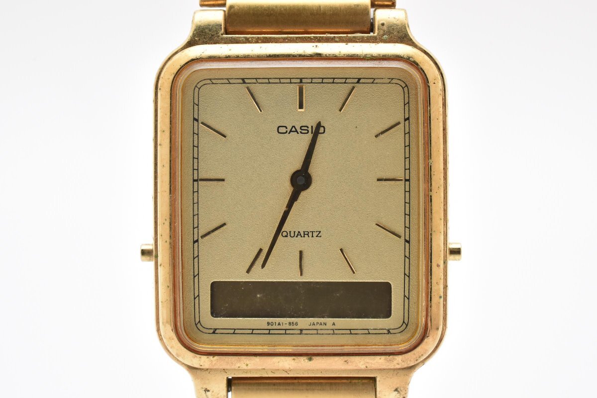 - CASIO QUARTZ カシオ クォーツ スクエア レクタングル 腕時計 メンズ アナログ 2針 アナログ デジタル ゴールド AQ-703