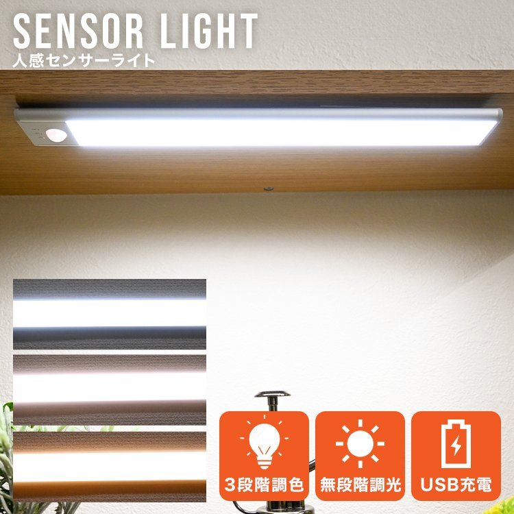 - 人感センサーライト LED 充電式 30cm 3段階調色 薄型 軽量 室内 玄関 廊下 防犯 トイレ 足元灯 フットライト 3段階調色 自動点灯