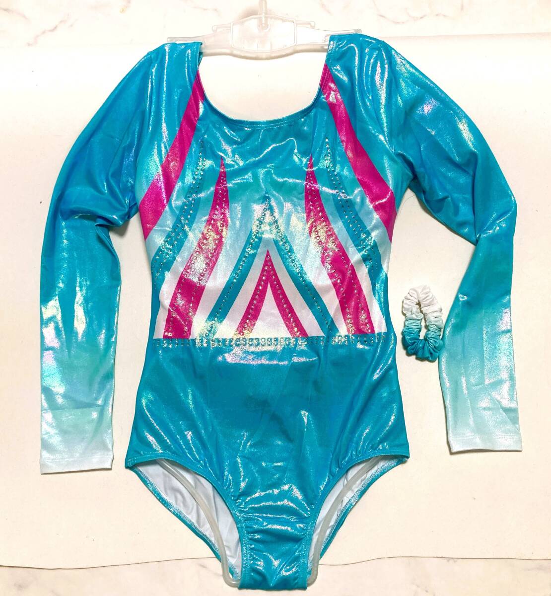 > US14サイズ Poly Unicorn レイクブルーカラーロングスリーブ 長袖レオタードシュシュ付 ツルスベ メタリック キラキラ ラインストーン